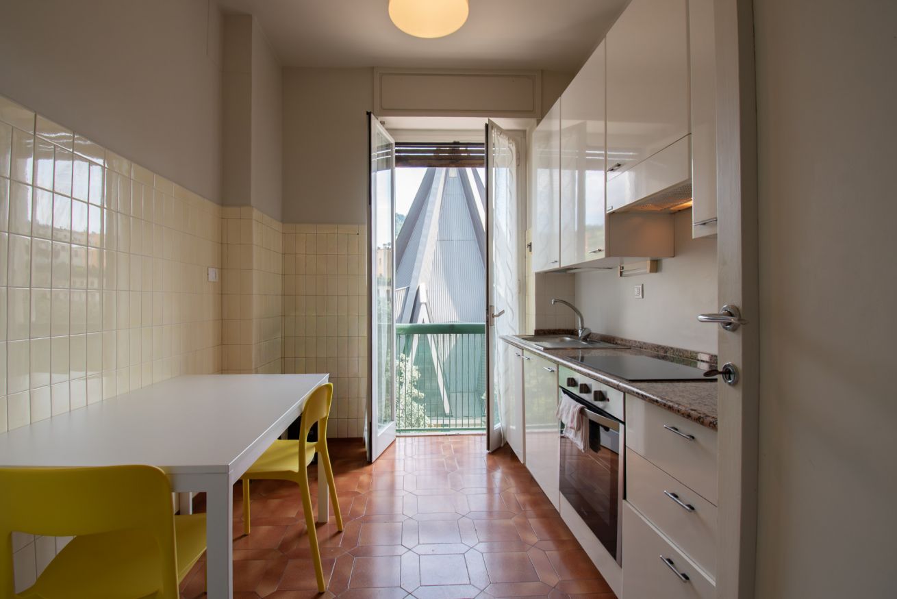 La cucina è dotata di tutto il necessario per un soggiorno breve e non: piano cottura ad induzione, frigo con freezer, microonde, macchinetta del caffè.